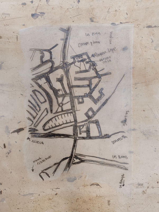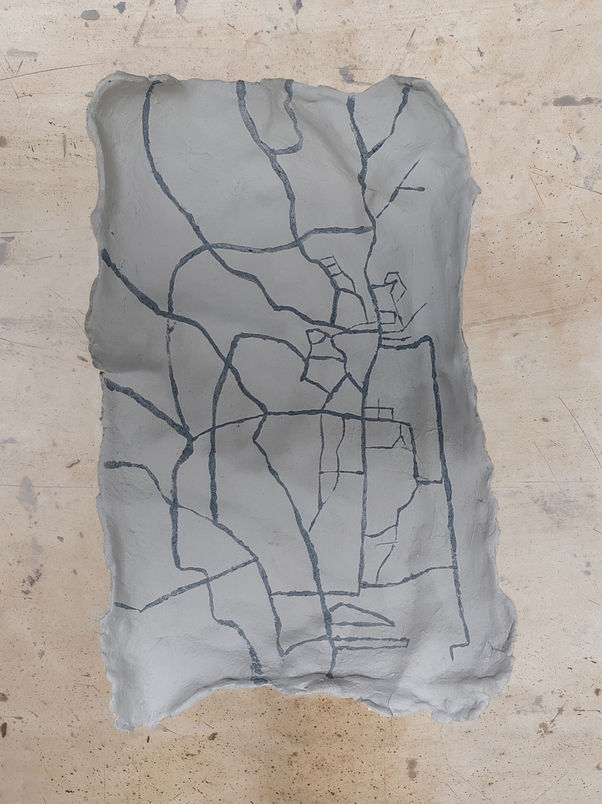 I am currently developing a new body of work that responds to the experience of retrieving childhood memories upon my return to the Don River area in Aberdeenshire, Scotland, after an interval of three decades. Experimenting with paper, clay, sand, graphite, map tracing and satellite imagery, this project unfolds from the phenomenological exploration of remembering with the land, and practicing embodied research in the territory, in search for different modes of representation of my own memory’s cartography.